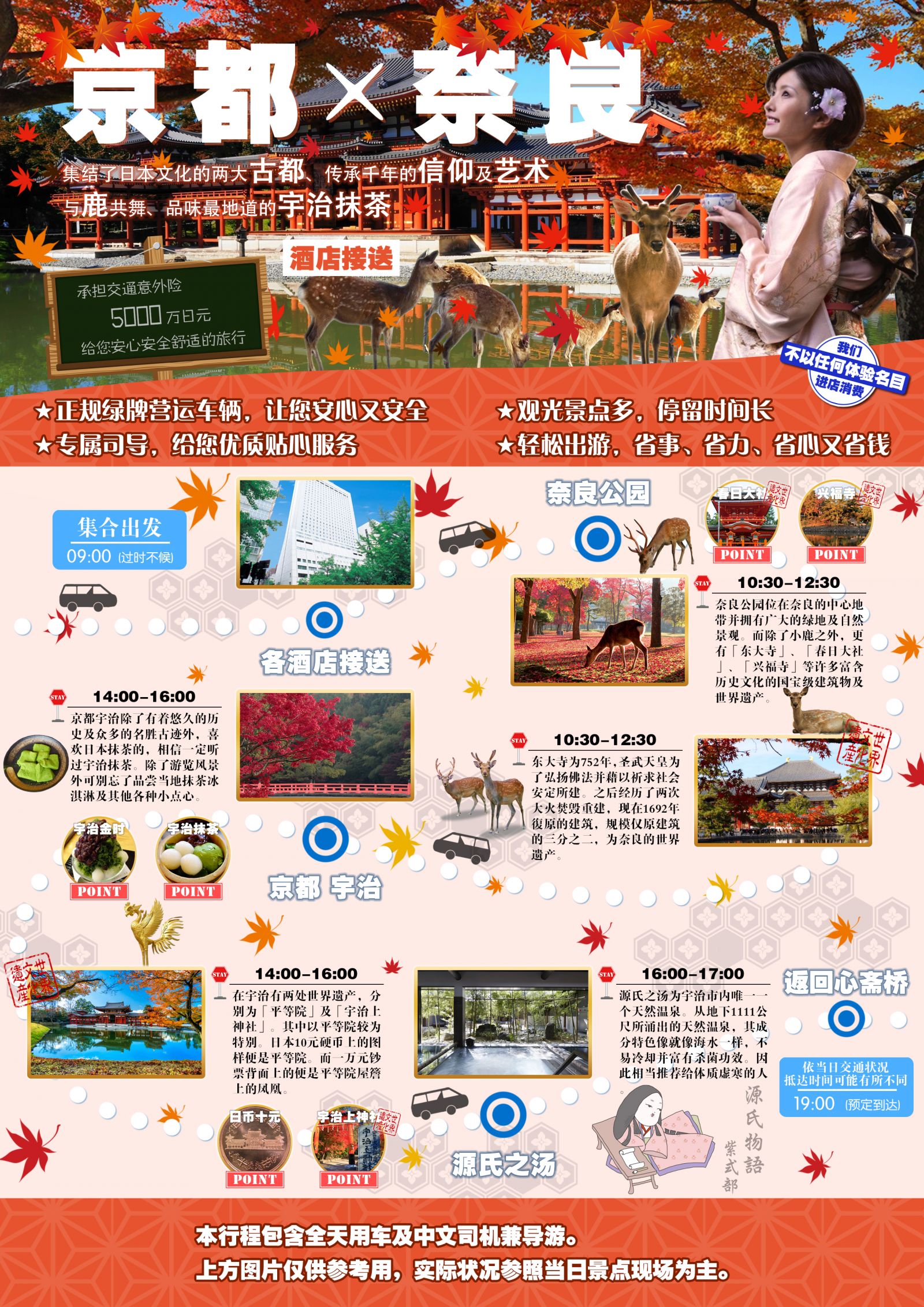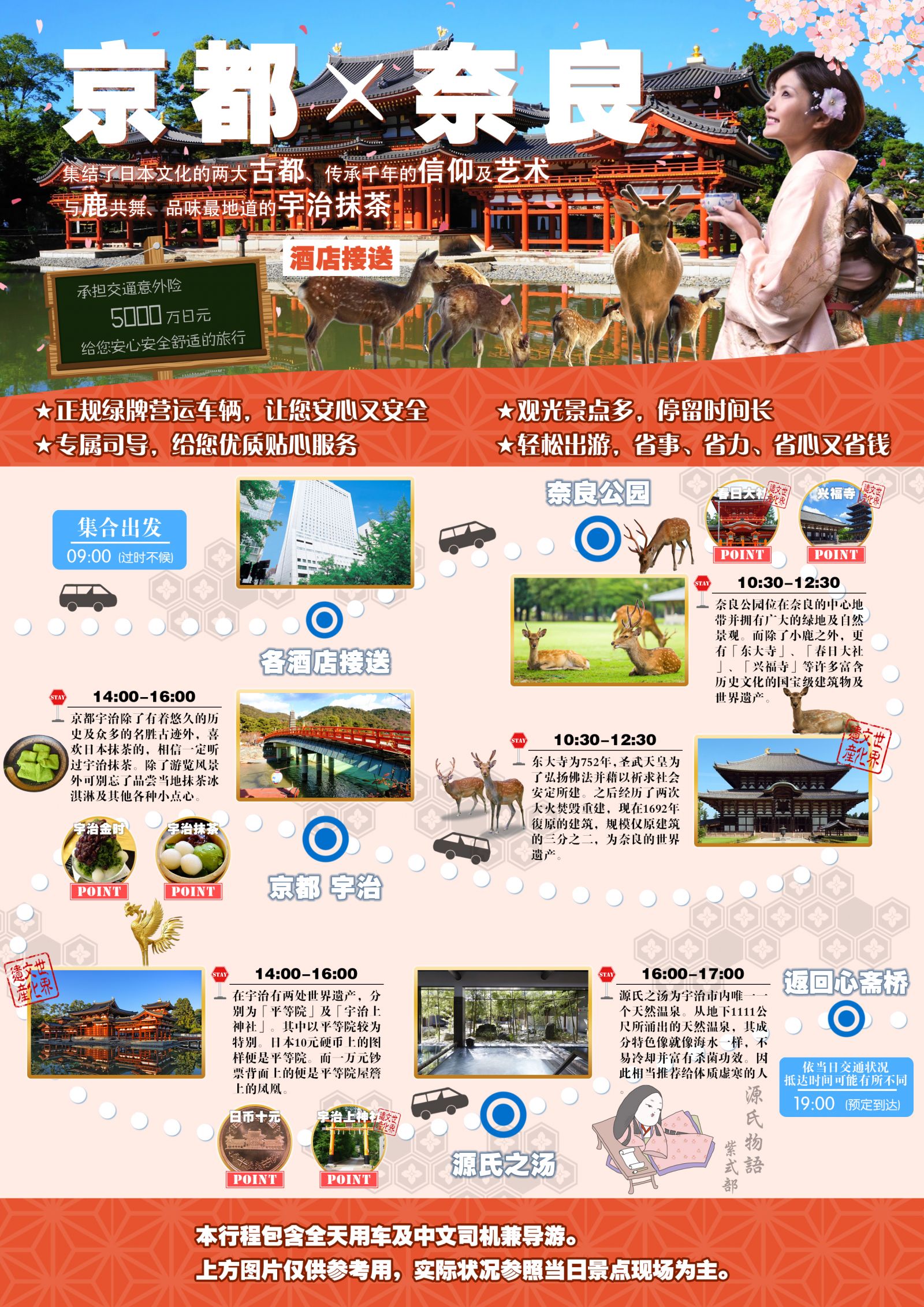 09:00大阪日本桥2号口接 → 10:30奈良公园 → 14:00京都 宇治 → 16:00源氏之汤 → 19:00送至心斋桥